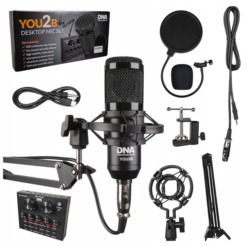 DNA YOU2B - MIKROFON POJEMNOŚCIOWY STUDYJNY GAMINGOWY INTERFEJS USB STATYW FILTR ZESTAW Zestaw mikrofonowy z interfejsem audio USB, statywem i okablowaniem