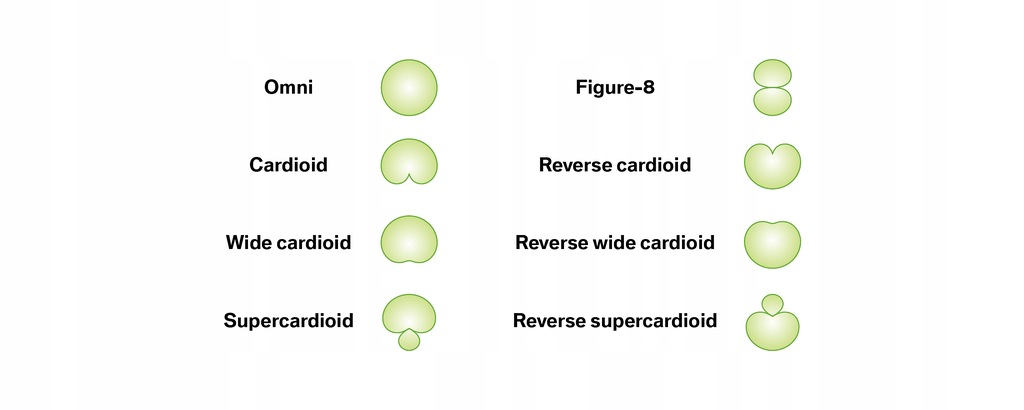 - Charakterystyka biegunowa dookólna, szeroka kardioidalna, kardioidalna, superkardioidalna, ósemkowa, odwrócona - kardioidalna, odwrotna szeroka kardioida, odwrotna Superkardioidalna;