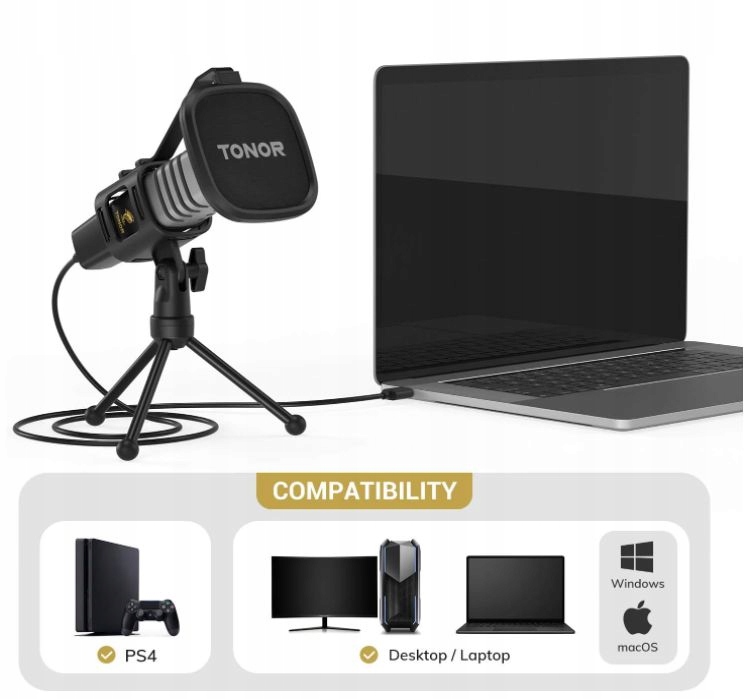 Pojemnościowy mikrofon USB do komputera stacjonarnego lub laptopa, z trójnożnym statywem, filtrem pop i mocowaniem antywibracyjnym, dla nagrywających podcasty, filmy na YouTube, transmisje i do rozmów na Skype.