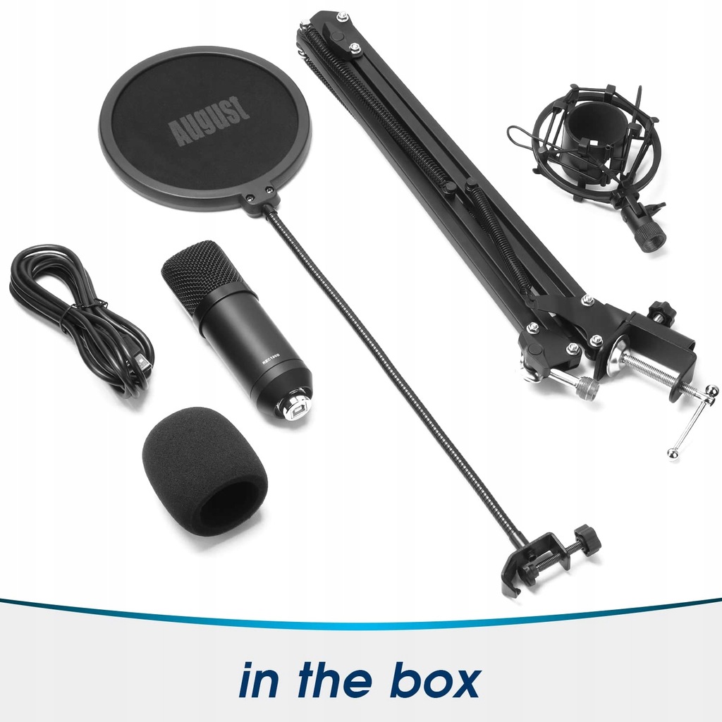 - nazwa przedmiotu: Mikrofon pojemnościowy studyjny USB z regulowanym ramieniem Jednokierunkowy - August REC100 - Profesjonalny mikrofon kardioidalny do PC i laptopa, zestaw do nagrywania podcastów gier rozmów Zoom Teams - Mocowanie amortyzujące z dołączanym pop filtrem