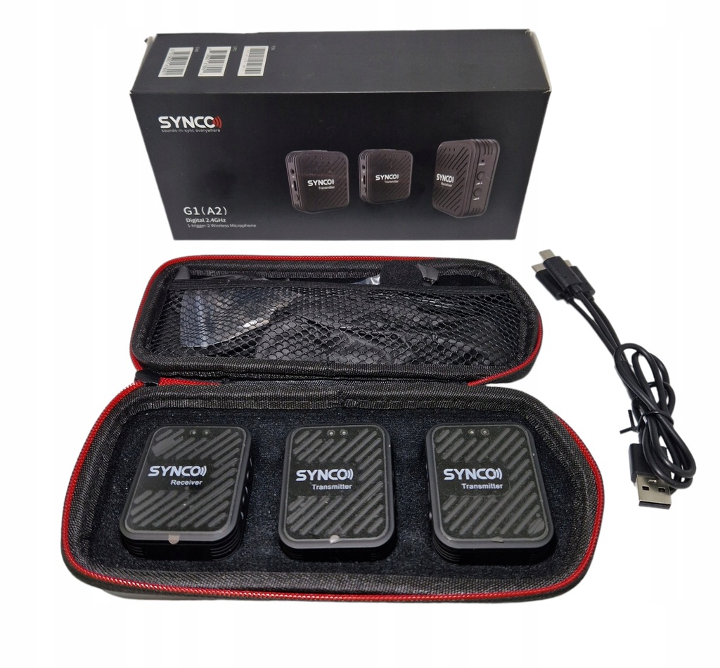 SYNCO G1 A2 to zestaw składający się z 2 nadajników z wbudowanym mikrofonem i 1 odbiornika umożliwiających bezprzewodową wymianę sygnałów między urządzeniami oddalonymi maksymalnie o 50 metrów od siebie, a litowe akumulatory gwarantują 5-godzinną pracę zestawu.