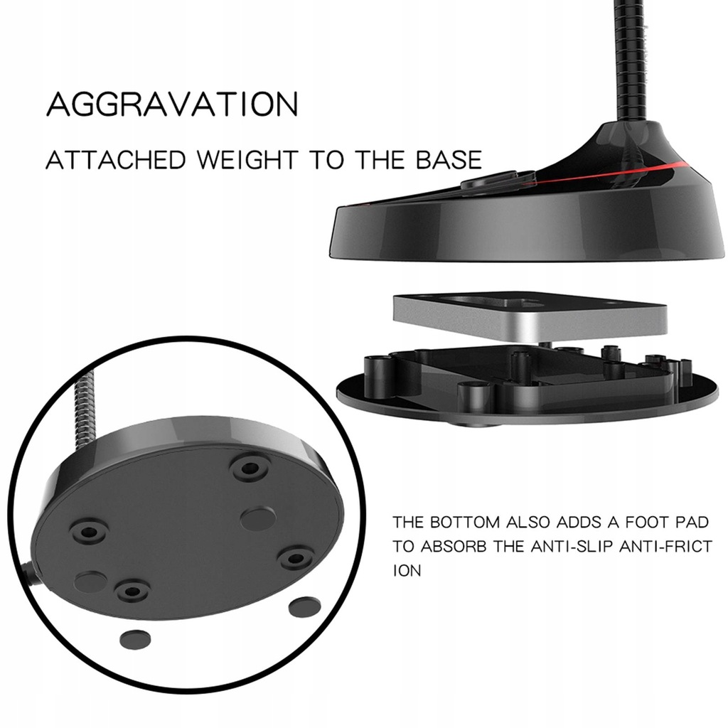 W podstawie zaprojektowano niezależny przełącznik, który można włączać i wyłączać do , wygodniejszy w użyciu Wbudowany metalowy ciężarka, mikrofon można stabilnie umieścić na pulpicie, niełatwo go upaść