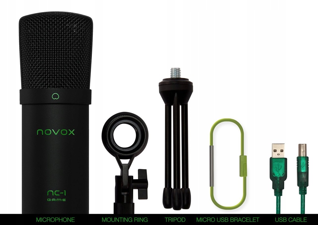 Novox NC-1 GAME jest wyposażony we wszystkie niezbędne akcesoria: uchwyt mikrofonowy, statyw biurkowy oraz kable USB i micro-USB. Bezpośrednio już po zmontowaniu urządzenia i podłączeniu do komputera czy konsoli można korzystać i cieszyć się grą.