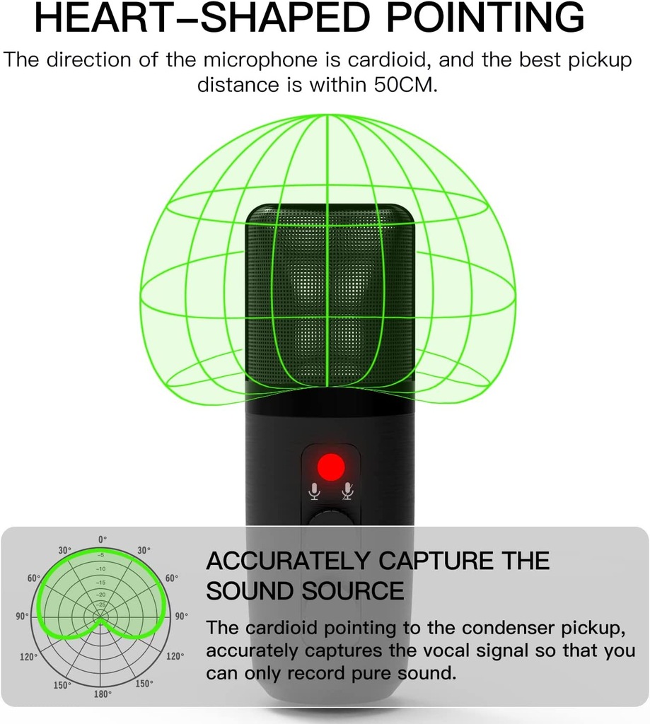 - Technologia kondensatora wskazującego kardioidę - Wskazywanie kardioidalne zmniejsza potrzebę odbioru dźwięku z boku i z tyłu oraz poprawia izolację wymaganego źródła dźwięku. Wysoka czułość, niskie zniekształcenia i funkcja przeciwzakłóceniowa, które zapewniają najbardziej realistyczny dźwięk