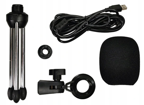 W zestawie znajdują się wszystkie potrzebne akcesoria, takie jak: uchwyt mikrofonowy oraz statyw biurkowy, osłona przeciwwietrzna i długi 2,7-metrowy przewód USB.