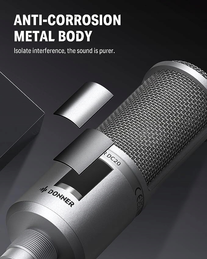 Korpus mikrofonu wykonany jest z wytrzymałego stopu cynku. Mikrofon jest również dostarczany z uchwytem przeciwwstrząsowym i filtrem pop, nie jest wymagany żaden dodatkowy zakup. DC-20 to idealne rozwiązanie dla początkujących mikrofonów z ograniczonym budżetem, którzy chcą zapewnić wspaniały dźwięk bez kompromisów.