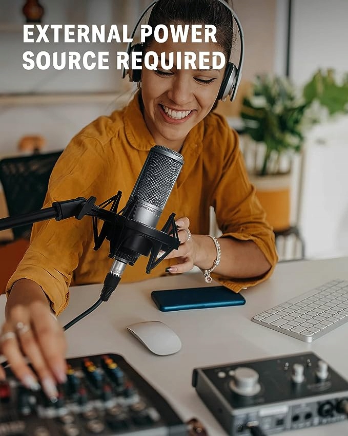 Mikrofon jest wyposażony w złącze XLR, które zapewnia wciągający dźwięk podcastów. Jeśli chcesz podłączyć mikrofon do komputera lub laptopa, upewnij się, że masz zasilanie phantom lub kartę dźwiękową lub inne urządzenia, które mogą zapewnić napięcie 48 V. (NIE ZAWARTE W PAKIECIE)