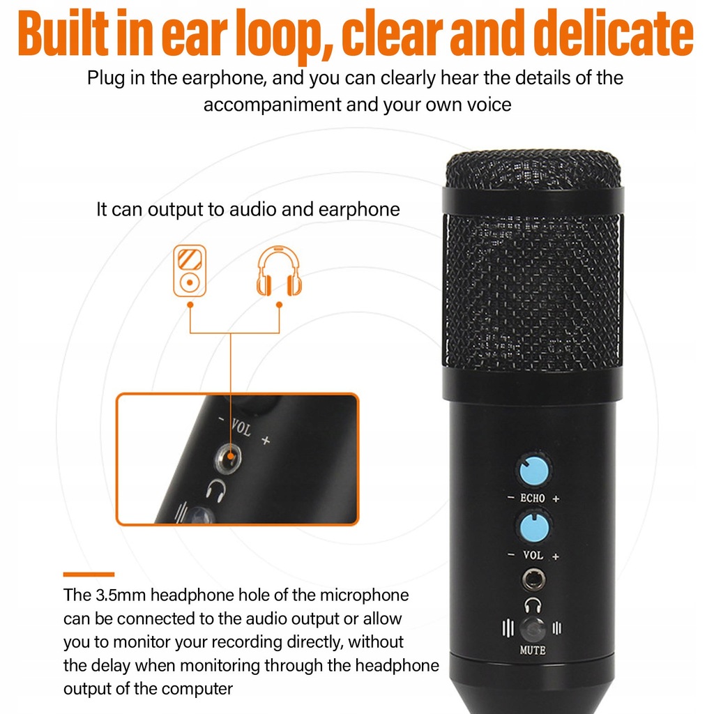 3. Z funkcją pętli na ucho: Mikrofon posiada pętlę na ucho, którą można w czysty i delikatny sposób włożyć do słuchawki, aby wyraźnie słuchać szczegółów akompaniamentu i własnego głosu.