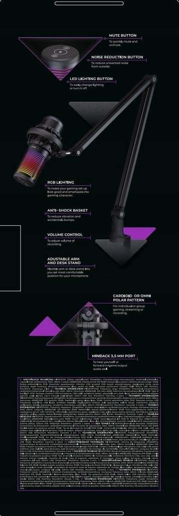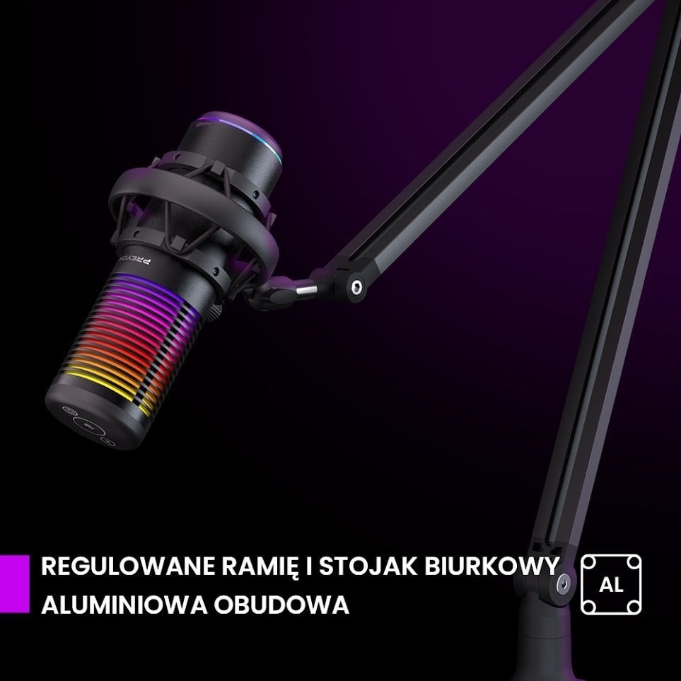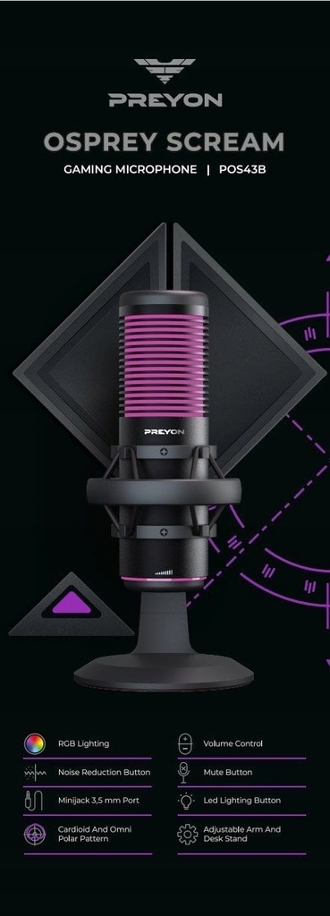 Mikrofon gamingowy to jedyne narzędzie w krytycznej dla zespołu sytuacji, na którym gracz może polegać. W grze o rezultacie starcia mogą zadecydować sekundy, dlatego wypowiedziany przez nas komunikat musi dotrzeć do reszty w każdym z przypadków. PREYON Osprey Scream sprawnie wyławia głos spośród szumu wentylatorów komputera, stukania klawiatury i przesuwającej się po podkładce klikającej myszki. A wszelkim dodatkowym zakłóceniom zapobiega zamontowany na mikrofonie koszyk antywstrząsowy. Dołączony do zestawu stojak biurkowy pozwala bezpiecznie umieścić mikrofon na blacie, a regulowane ramię i zacisk przymocować mikrofon do biurka. Taki zakres akcesoriów gwarantuje dopasowanie do dowolnego gamingowego stanowiska. PREYON Osprey Scream to doskonały starter pack dla aspirujących streamerów i podcasterów. Ale i doświadczonym w potrzebie też niczego nie zabraknie. Praca w dwóch trybach Pokrętło umieszczone na tyle PREYON Osprey Scream pozwala na zmianę kierunkowości mikrofonu z trybu kardioidalnego na tryb dookólny i odwrotnie. Tryb kardioidalny jest najlepszym wyborem dla graczy i streamerów, którzy potrzebują, aby mikrofon zbierał dźwięk tylko z jednej strony. Tryb dookólny, jak nazwa może już sugerować, zbiera dźwięk ze wszystkich stron. To z kolei najlepsze rozwiązanie dla nagrywających odcinki podcastu, gdzie może być obecnych kilka osób po różnych stronach i zależy nam, aby każdą było wyraźnie słychać. Taka swoboda w przełączaniu trybów udowadnia, że PREYON Osprey Scream jest gotowy na każdy scenariusz. Sprawdzona specyfikacja Poziom ciśnienia akustycznego PREYON Osprey Scream wynosi do 110 dB, a to dla streamera oznacza co najmniej tyle, że nie zagłuszy mikrofonu głośnymi reakcjami na wydarzenia wyświetlane na ekranie monitora. PREYON Osprey Scream pracuje w częstotliwości od 20 Hz do 20 000 Hz, w tej samej, co ludzki aparat słuchu. Innymi słowy PREYON Osprey Scream wspaniale wpisuje się w obecne standardy wśród tożsamych mu peryferiów komputerowych. Funkcje dodatkowe Mikrofon PREYON Osprey Scream jest wyposażony w kilka dodatkowych funkcji, bez których żaden gracz nie może dziś się obejść. U podstawy umieszczono pokrętło regulacji głośności, by nie musieć już gubić się w ustawieniach mikrofonu na komputerze. Natomiast u samej góry znajdują się trzy dotykowe przyciski: redukcji hałasu zewnętrznego, wyciszenia oraz zmiany i wł./wył. podświetlenia. W związku z czym nie trzeba daleko sięgać, żeby wyciszyć samego siebie i zrobić sobie konieczną przerwę od grania. Personalizowane
