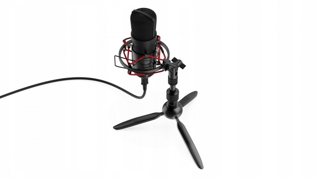 Pełny zestaw akcesoriówMikrofon SPC Gear SM900T Streaming USB Microphone dostarczany jest wraz z całym zestawem przydatnych akcesoriów. Sam mikrofon montowany jest w koszyku antywstrząsowym, który w znacznym stopniu eliminuje różnego rodzaju drgania wywołane np. przez pisanie na klawiaturze bądź stukanie w blat biurka. Piankowy POP filtr z kolei, blokuje nadmierny ruch powietrza, na przykład podczas oddychania bądź wymawiania tzw. głosek wybuchowych oraz chroni mikrofon przed zabrudzeniami. Rozkładany, masywny trójnóg (tripod), będący podstawą dla SM900T, wykonany jest z dobrej jakości materiału, co zapewnia wysoką elastyczność w dobraniu jego pozycji, a przede wszystkim stabilne ustawienie mikrofonu na biurku. Składane nogi podstawy umożliwiają łatwe przenoszenie zestawu. SM900T wyposażony został w przewód USB o długości 1,8 m.