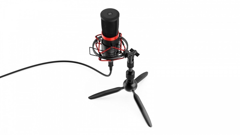 Pełny zestaw akcesoriówMikrofon SPC Gear SM950T Streaming USB Microphone dostarczany jest wraz z całym zestawem przydatnych akcesoriów. Sam mikrofon montowany jest w koszyku antywstrząsowym, który w znacznym stopniu eliminuje różnego rodzaju drgania wywołane np. przez pisanie na klawiaturze bądź stukanie w blat biurka. Piankowy POP filtr z kolei, blokuje nadmierny ruch powietrza, na przykład podczas oddychania bądź wymawiania tzw. głosek wybuchowych oraz chroni mikrofon przed zabrudzeniami. Rozkładany, masywny trójnóg (tripod), będący podstawą dla SM950T, wykonany jest z dobrej jakości materiału, co zapewnia wysoką elastyczność w dobraniu jego pozycji, a przede wszystkim stabilne ustawienie mikrofonu na biurku. Składane nogi podstawy umożliwiają łatwe przenoszenie zestawu. SM950T wyposażony został w przewód USB o długości 1,8 m.