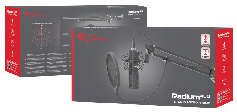 Myślisz o tym jak rozwinąć swój kanał na YouTube albo ulepszyć jakość swoich transmisji on-line? Nic prostszego. Genesis Radium 400 to wysokiej jakości mikrofon studyjny zapewniający wysoką elastyczność montażu i czystość nagrywanego dźwięku. Zadowoli każdego, początkującego jak i już zaawansowanego streamer ‘a. Zestaw składa się z mikrofonu, ramienia wraz z elementami mocującymi, koszyka antywstrząsowego, pop-filtru oraz gąbki.