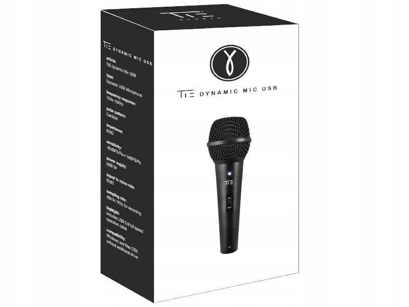 Wysokiej jakości, dynamiczny mikrofon do przemówień i śpiewu. Wyposażony w port USB, nie ma potrzeby stosowania dodatkowego interfejsu audio lub zewnętrznego źródła zasilania. Korpus i klatka są całkowicie wykonane z metalu i bardzo wytrzymałe. TIE Studio Dynamic Mic USB charakteryzuje się bardzo zrównoważonym dźwiękiem, a także znakomitą replikacją kierunkowości i sprzężenia zwrotnego. Zintegrowany filtr POP redukuje spółgłoski wybuchowe, minimalizuje dźwięki chwytania i uderzenia dzięki elastycznie zamontowanej obudowie.