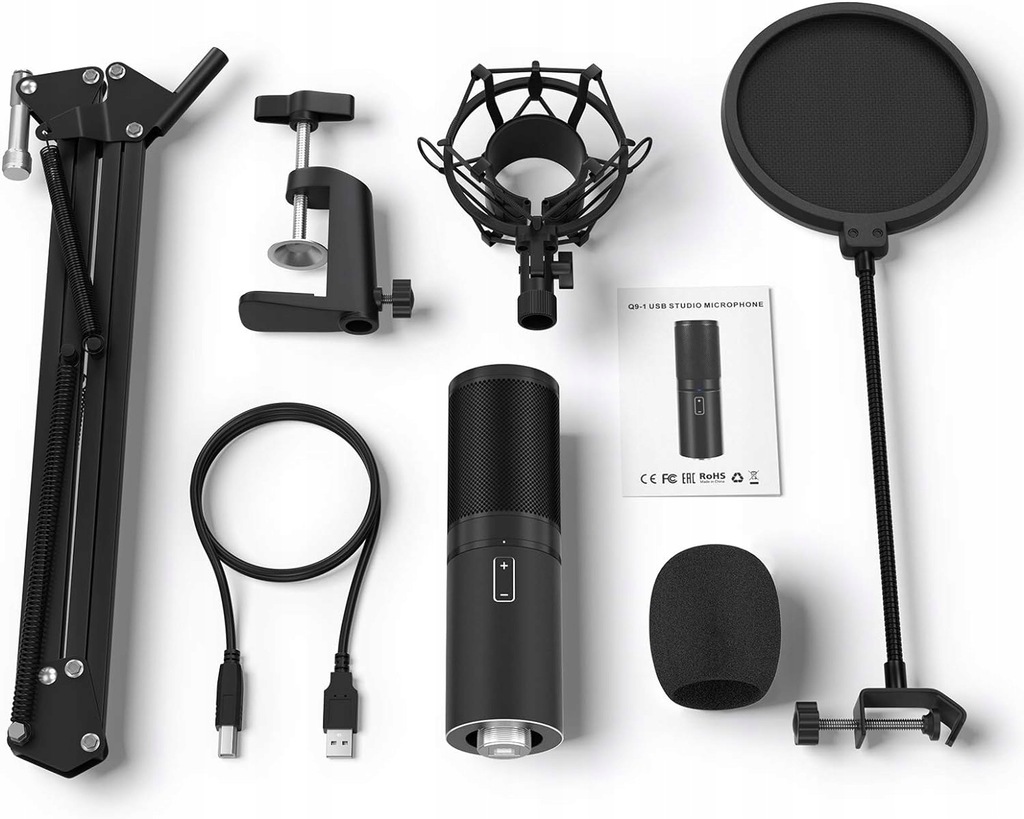 - Niezbędny zestaw startowy: Oszczędź sobie kłopotów z zakupem dodatkowych akcesoriów mikrofonowych. Zestaw Q9 zawiera wszystko, czego potrzebujesz, m.in. B. regulowany wysięgnik, metalowy uchwyt przeciwwstrząsowy, uchwyt na biurko, filtr pop, piankowa osłona mikrofonu, kabel USB A do B o długości 1,8 m
