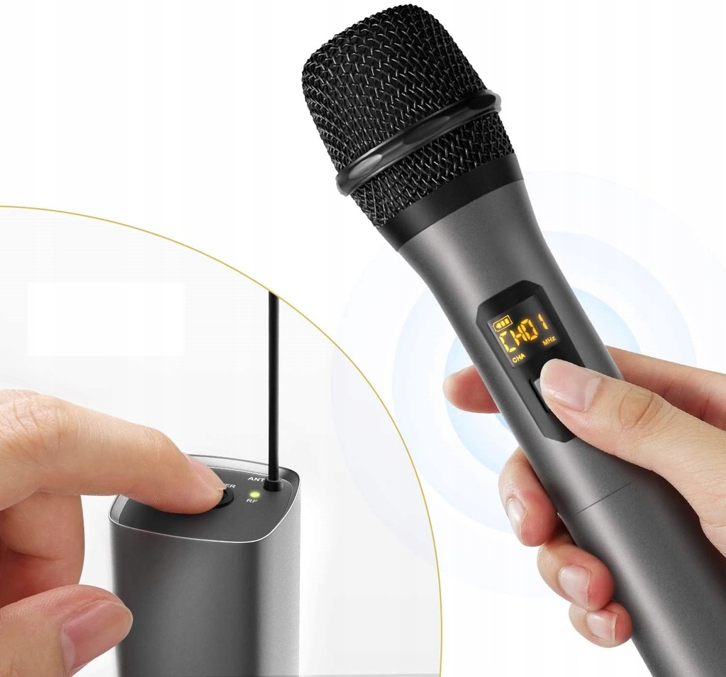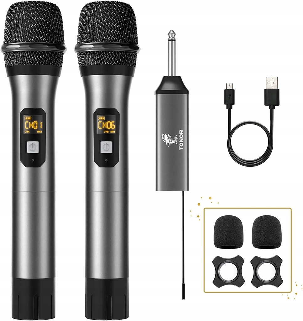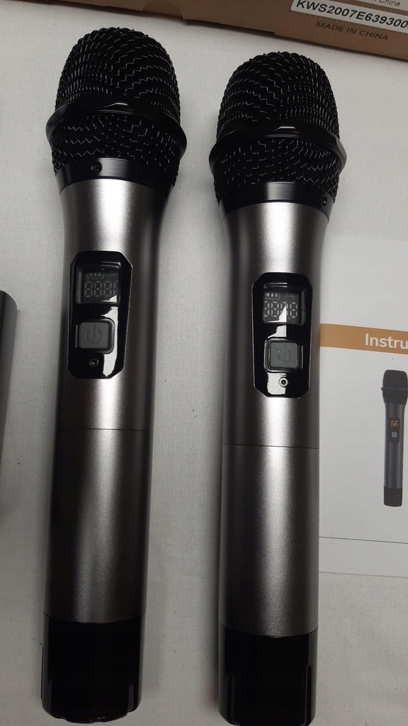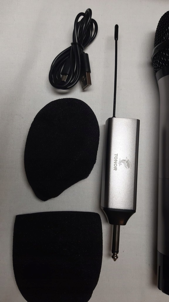 Zawartość: 2 x mikrofon ręczny, 1 x odbiornik z wtyczką 6,35 mm, 2 x pierścień antypoślizgowy, 1 x kabel do ładowania USB, 2 x pianka akustyczna.