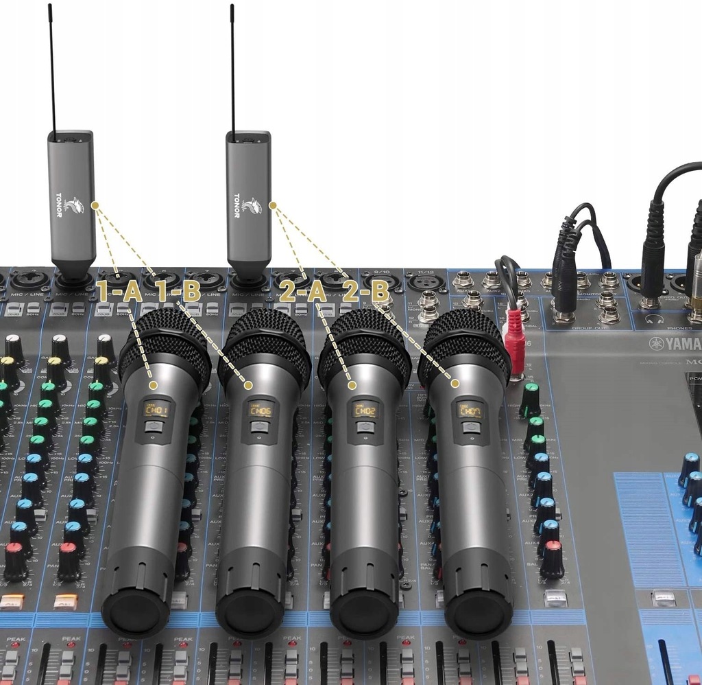 Wystarczy włączyć system, a odbiornik automatycznie zsynchronizuje częstotliwość z nadajnikami. 5 regulowanych kanałów pozwala uniknąć zakłóceń radiowych; można używać do 5 zestawów jednocześnie.