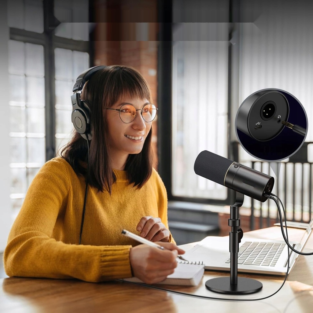 - Wyjście USB i XLR: Dzięki funkcji plug-and-play w trybie USB, mikrofon jest łatwy w obsłudze. Interfejs XLR dodatkowo podnosi jakość dźwięku, oferując wrażenia przestrzenne.