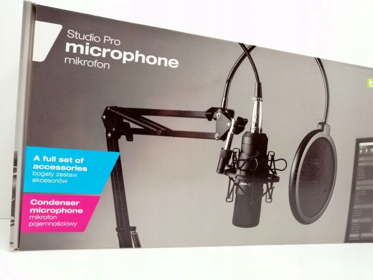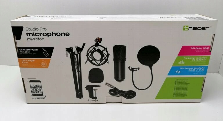 Wykorzystaj możliwości profesjonalnego zestawu z mikrofonem pojemnościowym TRACER Studio Pro o charakterystyce kardioidalnej.Mikrofon pojemnościowy z dużą membraną o charakterystyce kardioidalnej szczególnie dobrze sprawdzi się przy tworzeniu nagrań na YouTube, Podcast, Skype a także nagrań radiowych, konferencji , nagrań muzycznych, chat-ów oraz komunikacji w grach online. Działa bez dodatkowego zasilania i sterowników.W zestawie znajdują się następujące elementy :Mikrofon pojemnościowy z dużą membraną solidna metalowa konstrukcja podłączany na profesjonalny wtyk typu XLR.Filtr POP i nakładka piankowa skutecznie chronią nagrania przed szumami, wiatrem i innymi zakłóceniami.Statyw Bezpiecznie i stabilnie bez huśtania się. Konstrukcja stalowa z podwójnym ramieniem. Maksymalna obciążalność 2,5 kg, długość ramion 40 cm. Wyposażony w gwint 6,25 mm (5/8), pasuje też do mikrofonów Blue Yeti, Blue Snowball.Uchwyt koszowy o średnicy 2,8 cm (1,1) pasuje do większości typów mikrofonów dostępnych na rynku.Możliwość pochylenia (120 st.) i obrotu ( 360 st.) i ruchu w poziomie pomagają w ustawieniu najlepszego kąta pochylenia, wysokości aby idealnie zaprezentować głos lub dźwięk instrumentu.Kabel mikrofonowy 3,5 mm męski do XLR wraz z przejściówką na podwójny typu żeńskiego. Długość 2,5 m.Zacisk stołowy.Instrukcja obsługi.