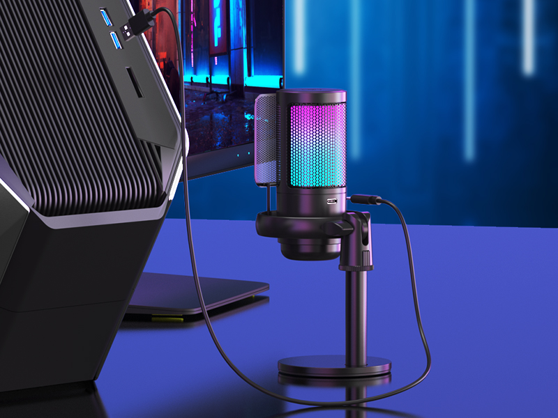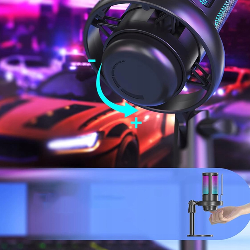 - Mikrofon do gier USB jest wyposażony w diodę LED RGB, która automatycznie zmienia się w wielu kolorach, dzięki czemu gra lub efekt na żywo bardziej przyciąga wzrok. (Naciśnij długo przycisk wyciszenia, aby zmniejszyć jasność światła RGB).