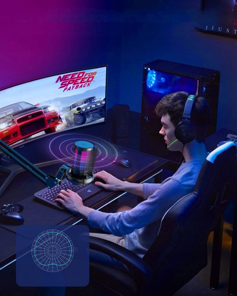 - Kardioidalny wzór odbioru współpracuje z mikrofonami do gier, redukując większość hałasu wentylatora lub otworu wentylacyjnego w wieży PC.