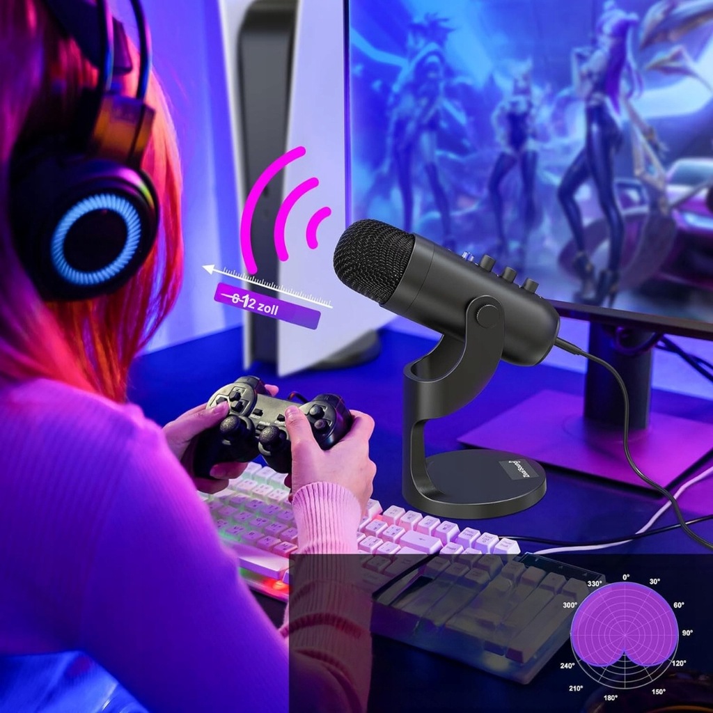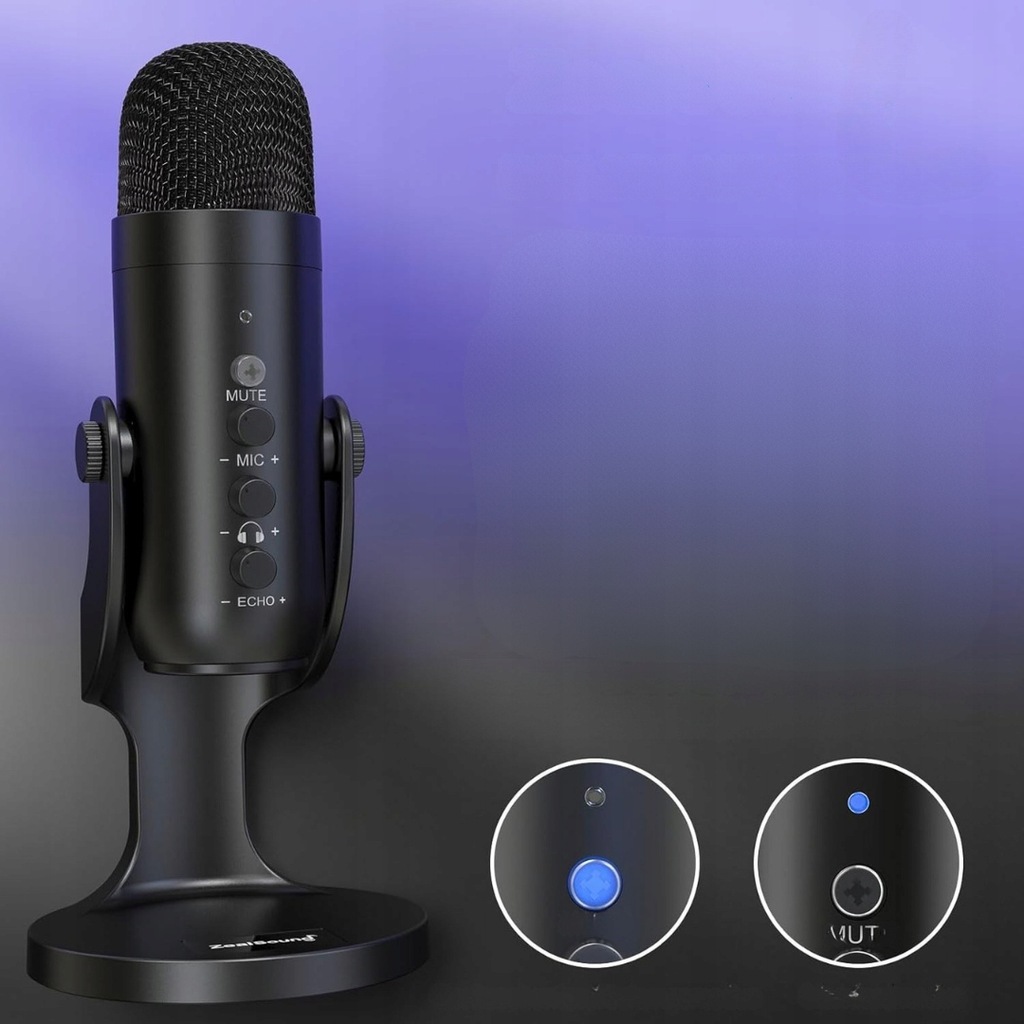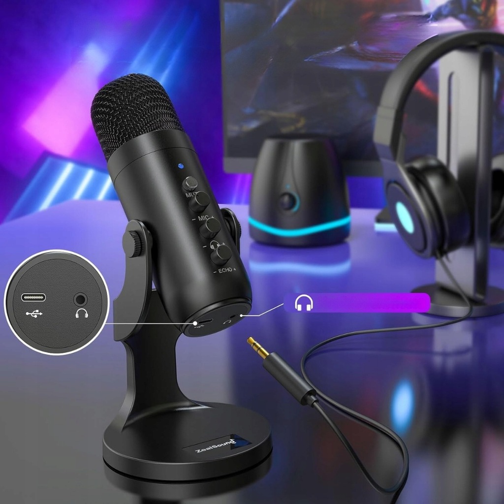 zealsound Mikrofon USB, mikrofon pojemnościowy do telefonu komórkowego, PS4, PS5, do gier, podcastów, nagrywania, streamingu, ASMR z wyciszeniem/wzmocnieniem/echo, adapter do telefonu.