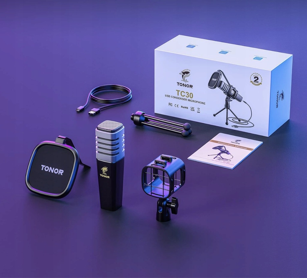 ✅ Co zyskasz: 1 x mikrofon pojemnościowy, 1 x mocowanie przeciwwstrząsowe, 1 x składany statyw mikrofonowy, 1 x filtr pop, 1 x kabel USB Type-C na USB-A 2.0 i 1 x instrukcja obsługi. Uwaga: jest kompatybilny z komputerami Mac, PC, PS4 i iPadem (wymagany adapter). Nie jest kompatybilny z telefonami i Xbox.