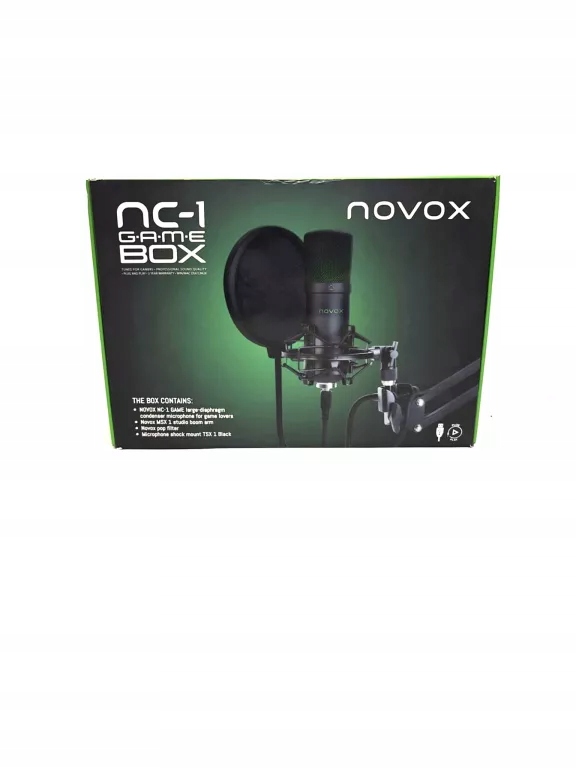 Novox NC-1 Game Box jest wyposażony we wszystkie niezbędne akcesoria: ramię mikrofonowe, statyw, koszyk antywibracyjny, uchwyt na mikrofon, kabel USB oraz popfiltr. Bezpośrednio po zmontowaniu mikrofonu i podłączeniu do komputera czy konsoli możesz bez przeszkód cieszyć się grą.