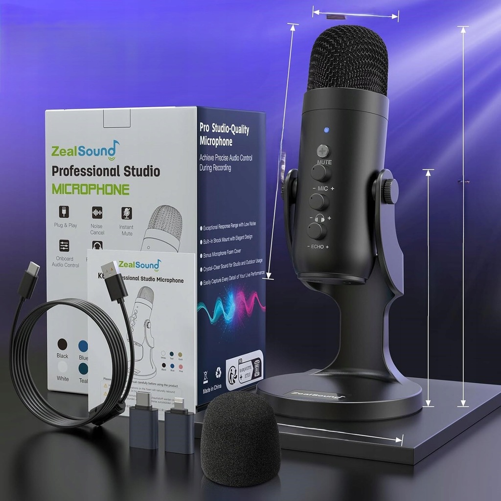 ☑️ W zestawie: Mikrofon, kabel USB, adaptery