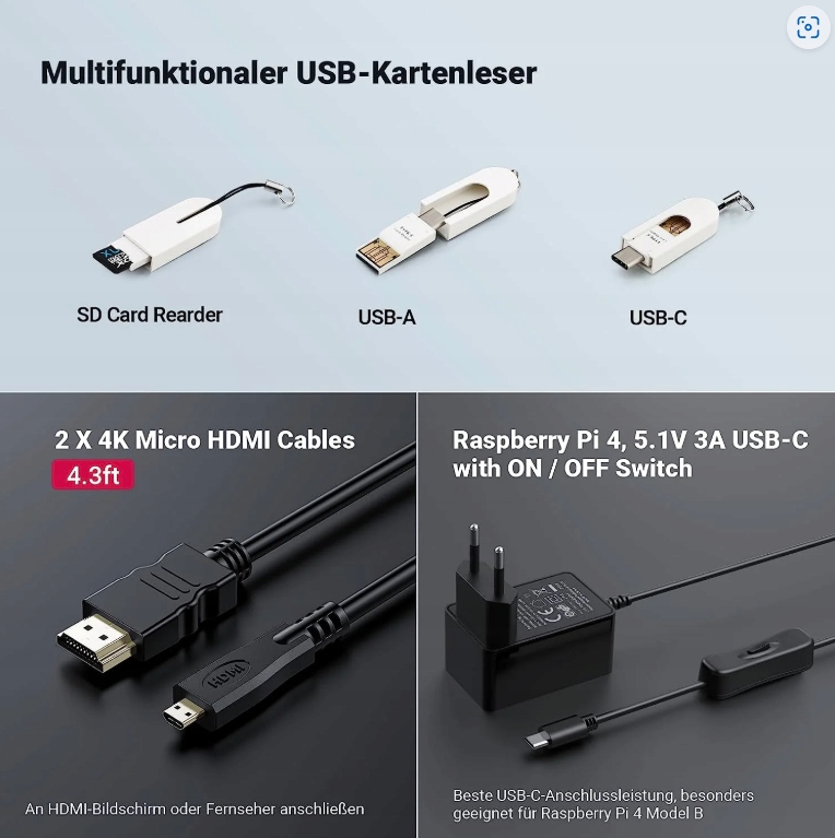 Karta Micro SD Sandisk 32GB Class 10: Fabrycznie zainstalowany Raspberry Pi OS (Raspbian), bardzo łatwy w użyciu nawet dla początkujących. Zestaw startowy Raspberry Pi 4 Model B 4GB RAM od LABISTS zawiera także czytnik kart micro SD kompatybilny z USB-A i USB-C.
