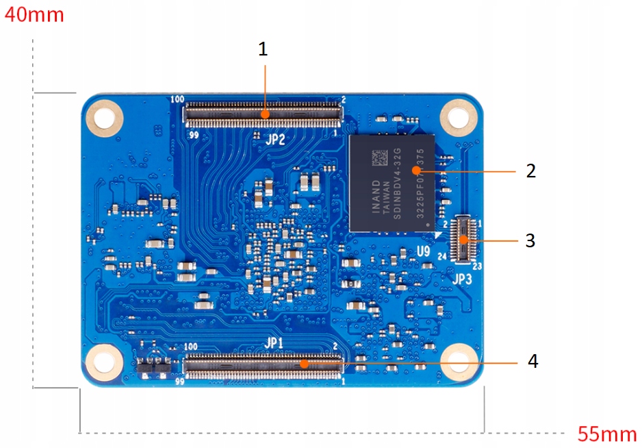 - Interfejsy: 1x USB3.0, 3x USB2.0, 2x 100Pin, 1x 24Pin, 1x HDMI 2.0 do 4K@60fps, 1x 2-lane MIPI DSI, 1x 4-lane MIPI DSI, eDP, 1x 4-lane MIPI CSI, SATA3 lub PCIe, RESET, MASKROM, RECOVERY, wejcie i wyjście jack Audio, wejście zasilające DC 5V, DC3.3V i 1.8V