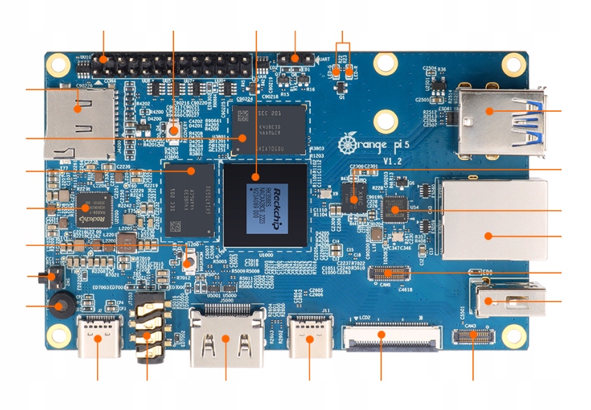 Orange Pi 5 posiada dużą ilość interfejsów, w tym wyjście HDMI, interfejs GPIO, M.2 PCIe2.0, Type-C, port Gigabit LAN, 2*USB2.0, 1*USB3.0, itp; Może być szeroko stosowany w tabletach, przetwarzaniu brzegowym, sztucznej inteligencji, chmurze obliczeniowej, AR/VR, inteligentnym bezpieczeństwie, inteligentnym domu i innych dziedzinach, obejmujących AIoT różnych branż.