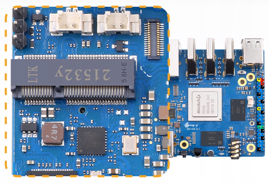 Mikrokomputer Orange Pi 5 Plus został wyposażony w gniazdo M.2 E-Key do obsługi modułu Wi-Fi6/BT.