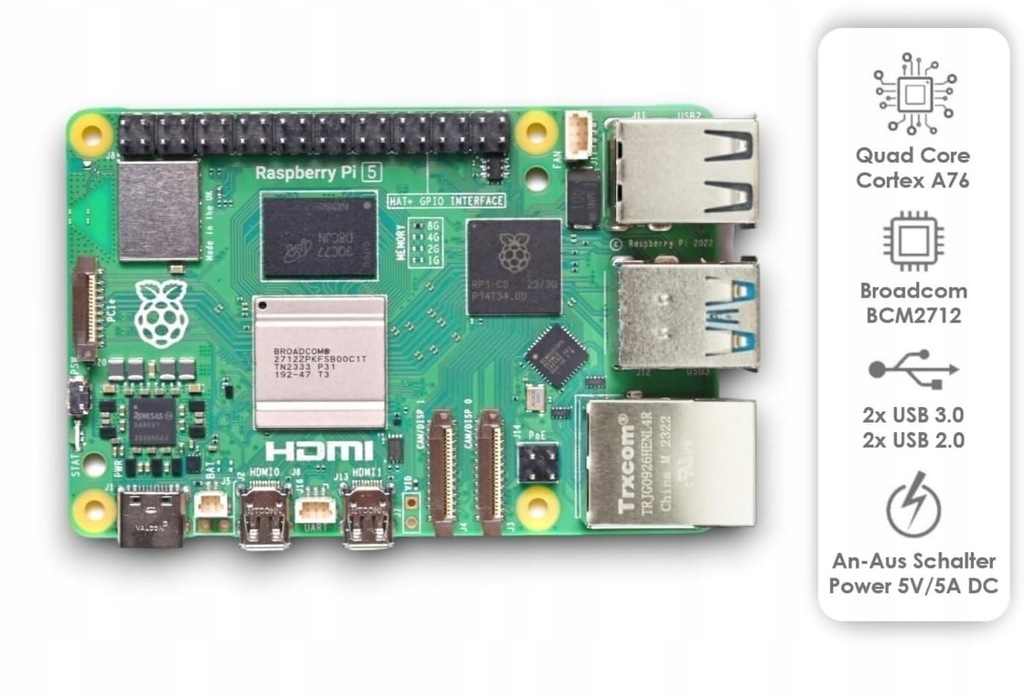 - Zawiera Raspberry Pi 5 (8 GB RAM) z czterordzeniowym procesorem ARMA76 (64-bit – 2,4 GHz) i zintegrowany procesor VideoCore VII 800 MHz GPU, który zapewnia 2-3 razy większą wydajność niż wersja 4. Znacznie ulepszone odtwarzanie grafiki ° 2 x USB 3.0 5 GBps ° 2 x 4-drożne złącza MIPI-DSI/CSI, nowe właściwości: ¤ Przycisk wł./wył. ¤ złącze PCIe 2.0 ¤ Zintegrowane złącze RTC