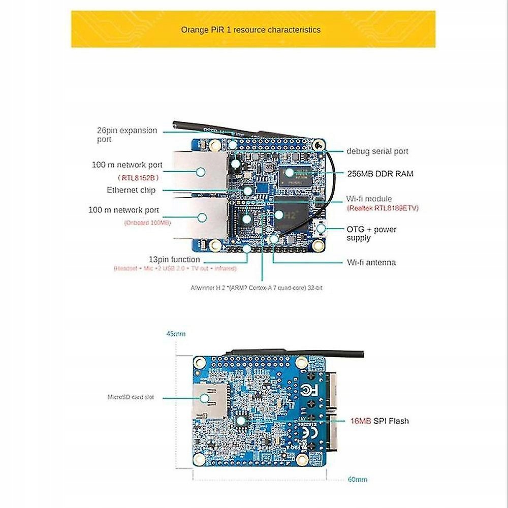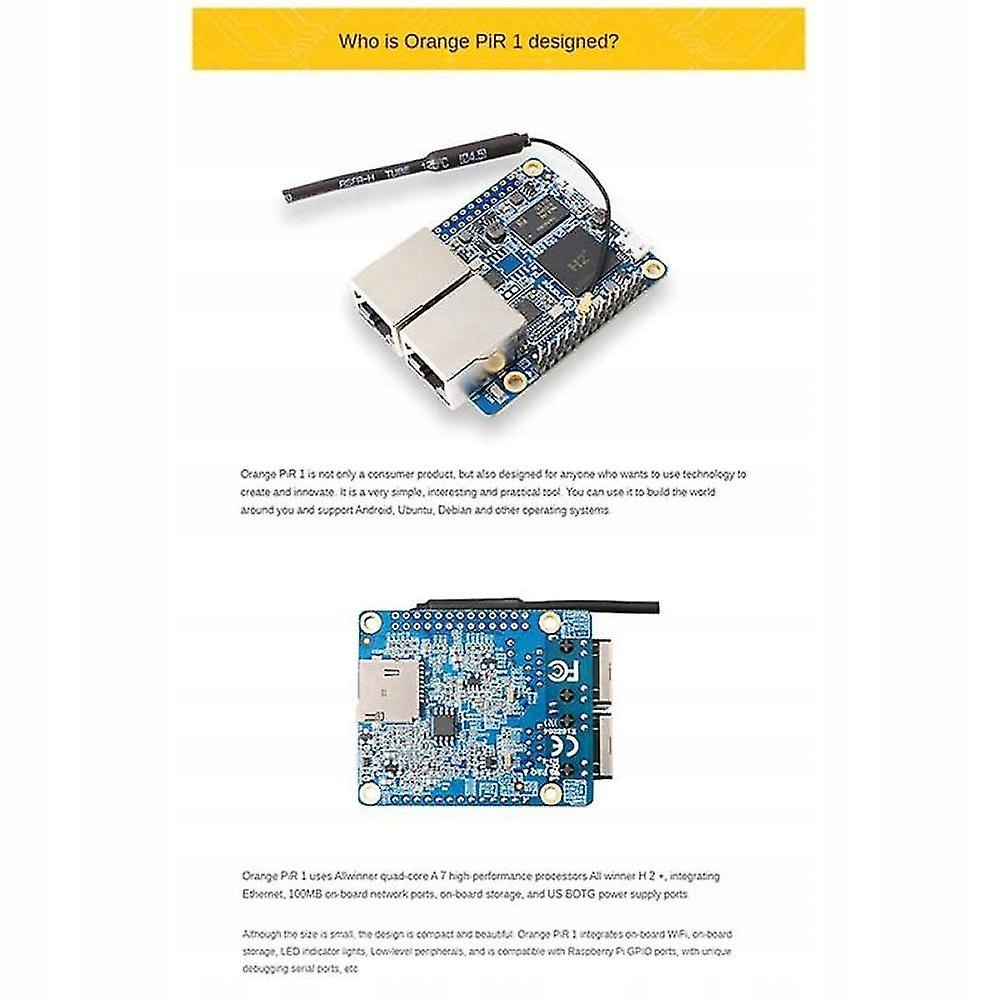 For Orange Pi R1 Allwinner H2 (Cortex-A7 quad-core) 32-bit CPU, a new generation of arm development board For Orange Pi R1 uses Allwinner's quad-core A7 high-performance processor Allwinner H2 , integrated Ethernet, 100M onboard network port, onboard storage, USB OTG supply port, etc.Despite its small size, the design is compact and beautiful. For Orange Pi R1 integrates on-board WiFi, on-board storage, LED indicators, low-level peripherals, and is compatible with tree GPIO ports, and has a unique debugging serial port, etc.It is a very simple, interesting and practical tool that you can use to create the world around you, and supports , Ubuntu, Debian and other operating systems.For orange pi orangepi R1 network port development board programming single chip microcomputerApplicable model: For OrangePi R1 Plus Model Number: Development BoardProcessor : AllwinnerIntergrated Feature: 10/100MbpsMemory (SDRAM): 256MB DDR3Video Outputs: Supports external board via 13pinscolor:BlueMaterial:PCBsize:45 x 60mmPackage Contents:1 x Development BoardOnly the above package content, other products are not included.Note: Light reflection and different displays may cause the color of the item in the picture a little different from the real thing. The measurement allowed error is /- 1-3cm.