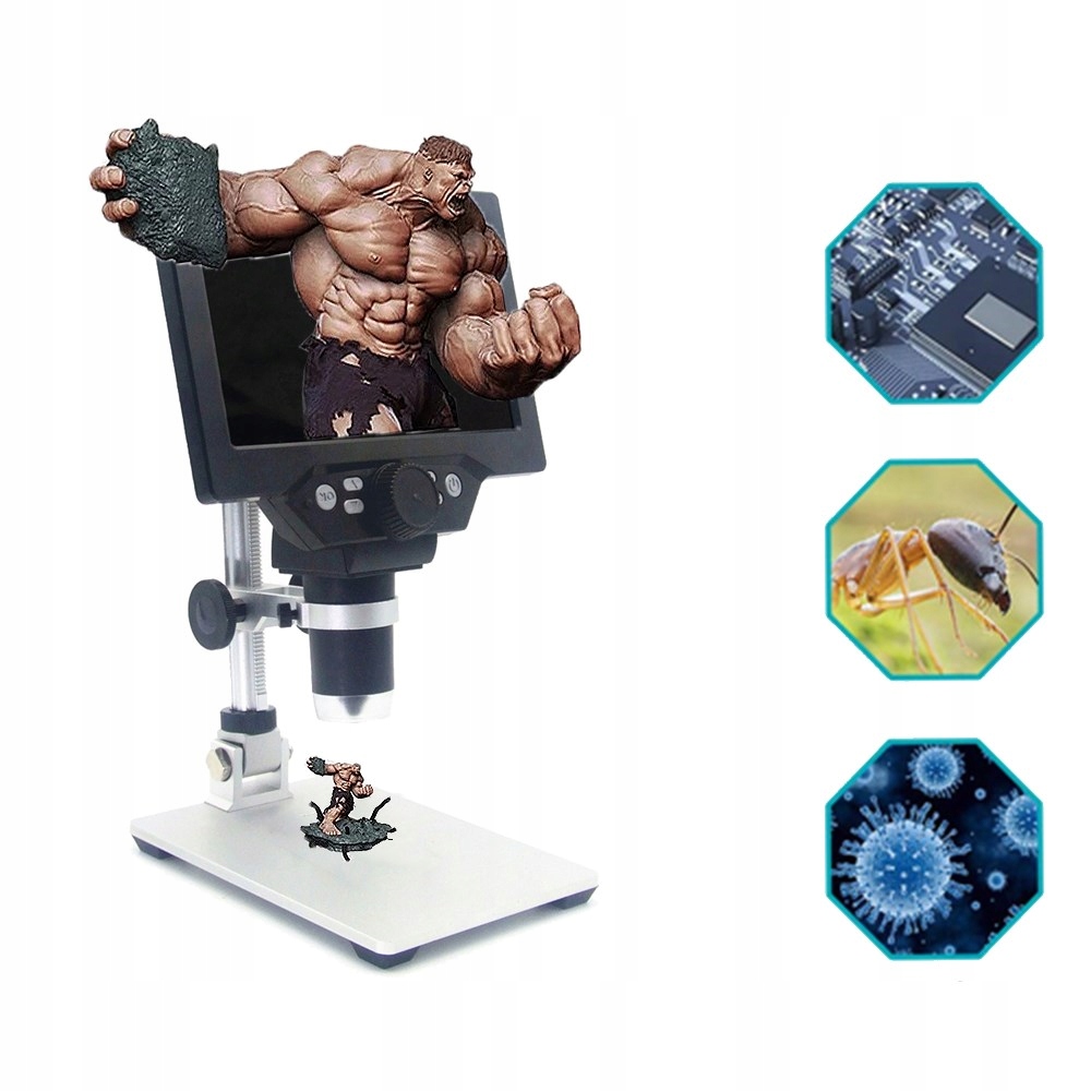 Mikroskop cyfrowy z kolorowym ekranem LCD o przekątnej ekranu 7 cali oraz matrycą o rozdzielczości 12 Mpx. Całkowite powiększenie do 1200x. Badany przedmiot jest wyświetlany natychmiastowo na ekranie, a 8 jasnych diod LED zapewnia doskonałe naświetlenie przedmiotu.