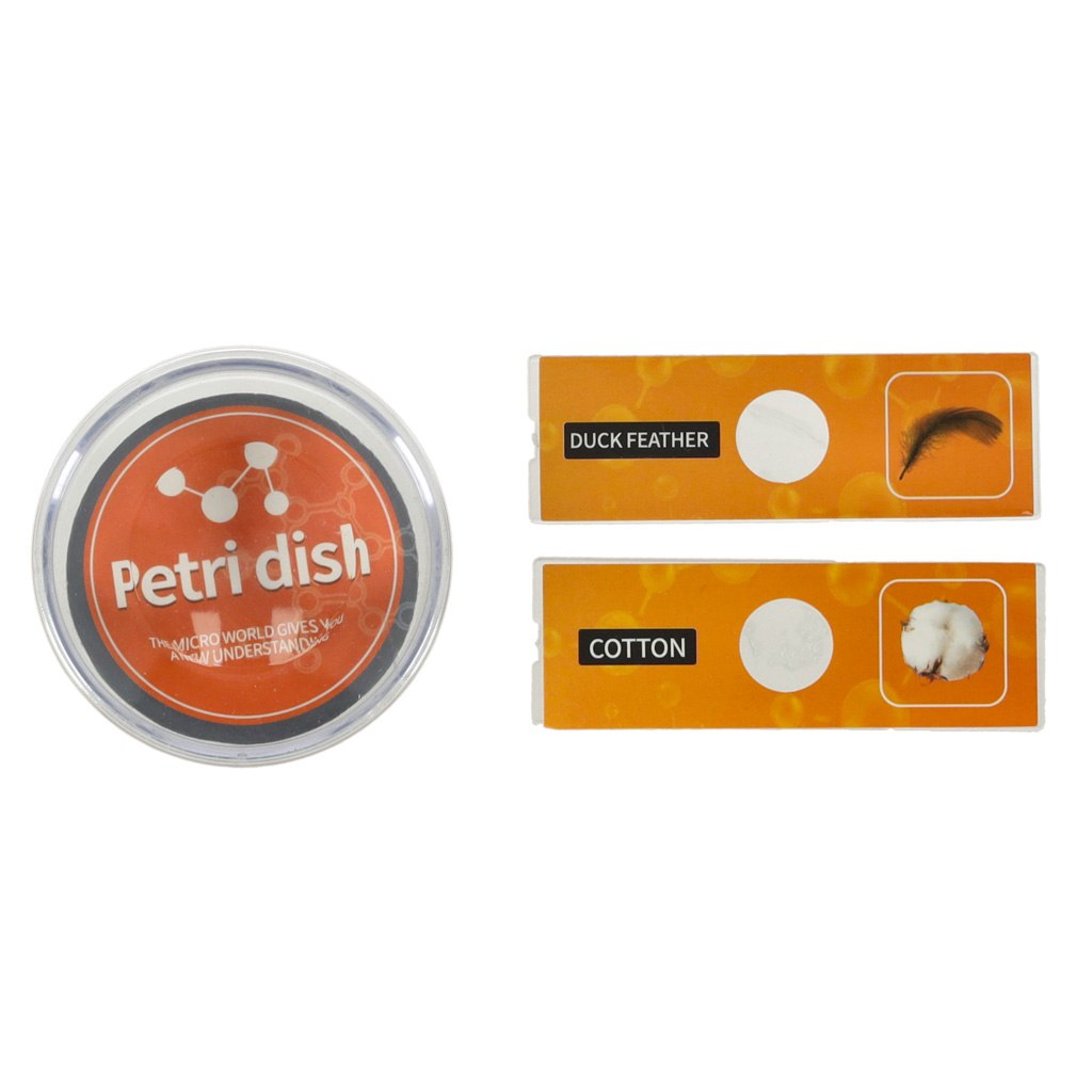 zawiera dwa gotowe szkiełka z próbkami (pióro kaczki i włókna bawełny),