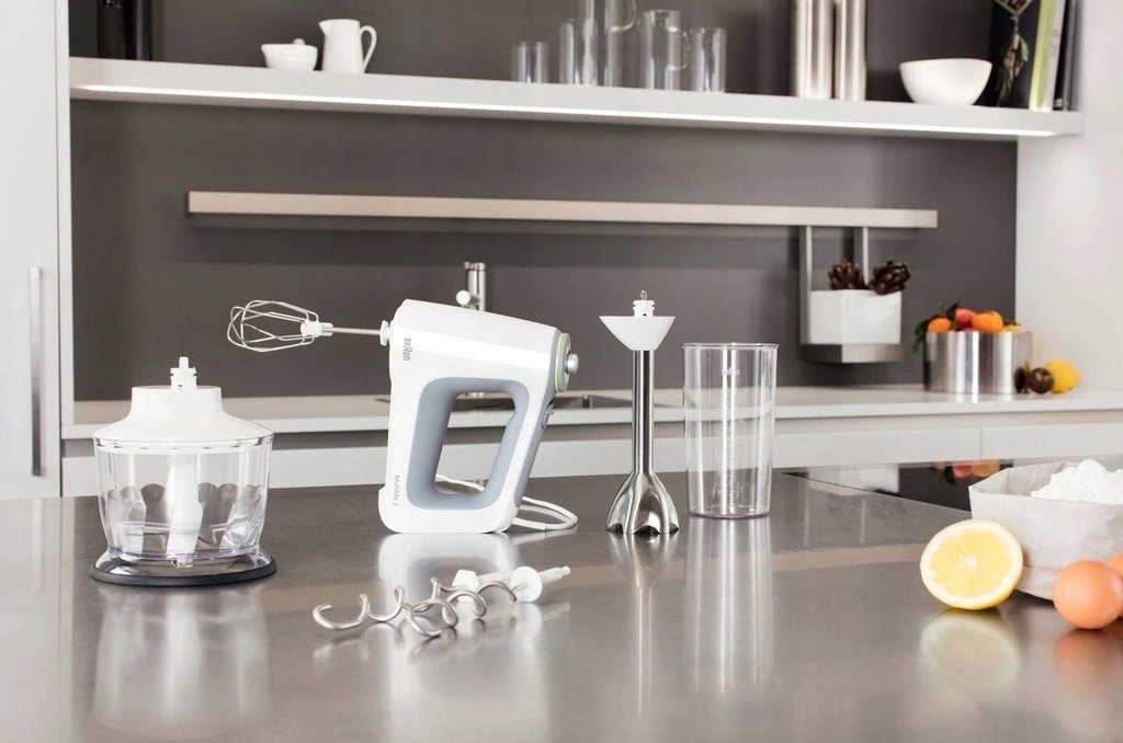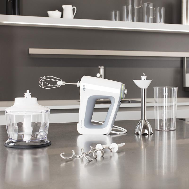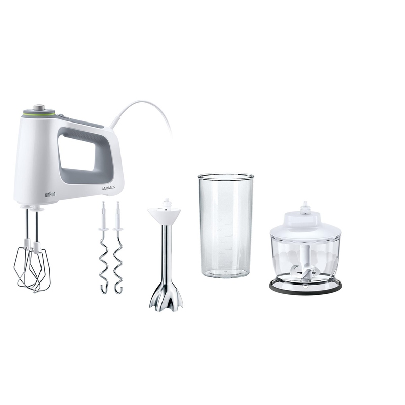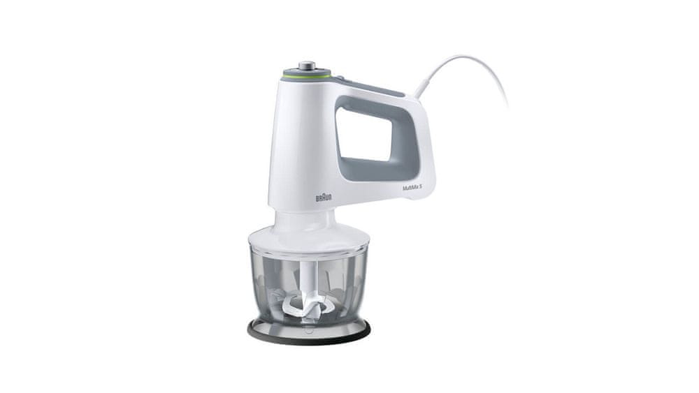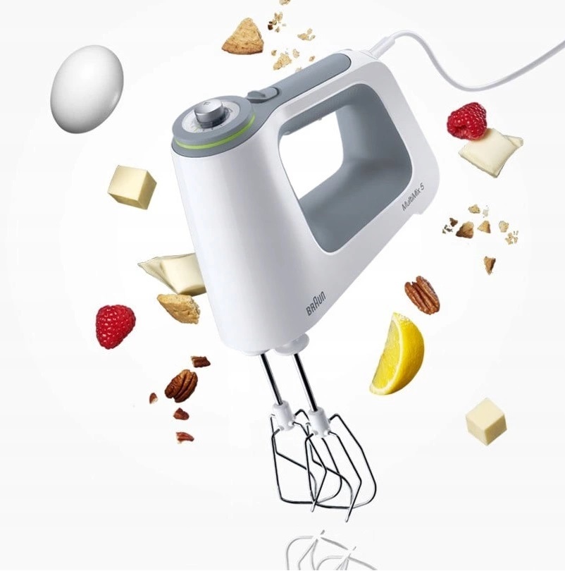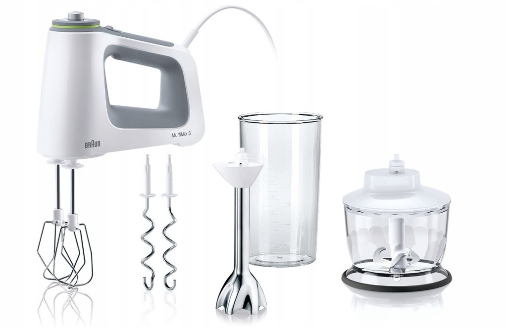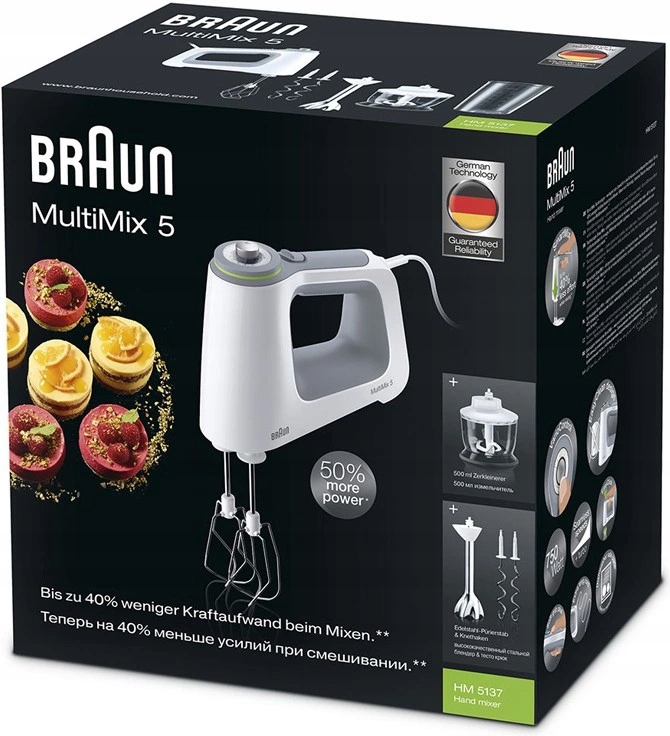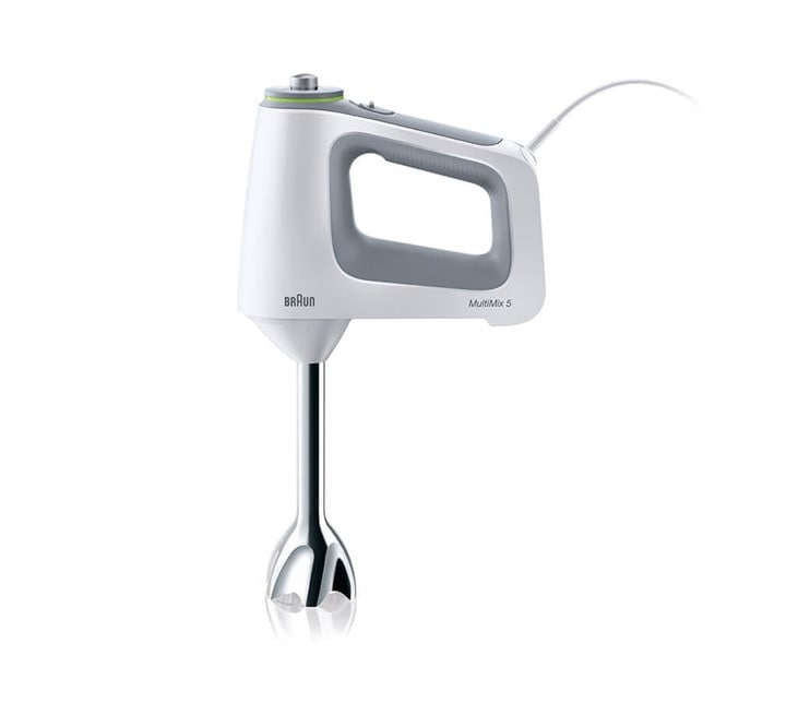 Blender ręczny Braun Multimix 5 z silnikiem o mocy 750 W oferuje 9 ustawień prędkości, co zapewnia łatwe i szybkie ubijanie, ugniatanie i mieszanie. Mikser oferuje również stopę blendującą z plastikowym pojemnikiem do mieszania i przystawką do rozdrabniania, dzięki czemu Multimix 5 staje się ubijaczem, blenderem i siekaczem w jednym. Konstrukcja blendera MULTIMIX jest gładka i nie posiada otworów wentylacyjnych. Dzięki temu nic niepożądanego nie dostanie się do wnętrza blendera, co zapewnia dłuższą żywotność produktu. Dodatkowo antypoślizgowy miękki uchwyt Softgrip i łatwa wymiana akcesoriów sprawią, że gotowanie będzie czystą przyjemnością.