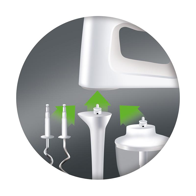 Technologia EasyClick umożliwia łatwą i szybką wymianę akcesoriów za pomocą tylko jednego kliknięcia. Niezależnie od tego, czy wybierzesz hak do trzepaczki, czy do wyrabiania ciasta, wystarczy nacisnąć pokrętło i szybko wymienić akcesoria.