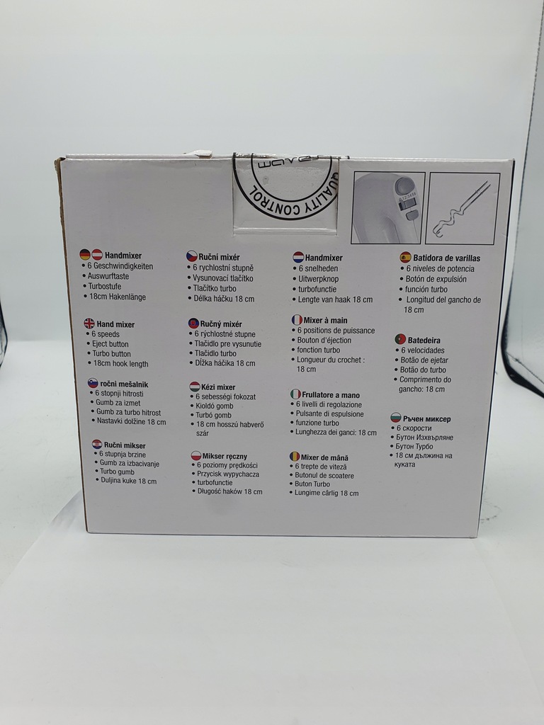 Mikser posiada 6 poziomów prędkości, przycisk wypychacza, turbofunctie, długość haków to 18cm.