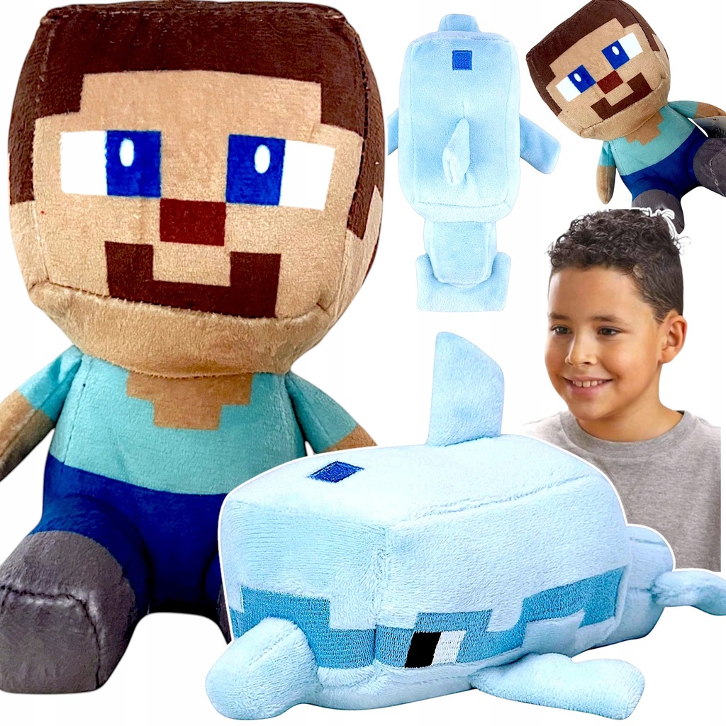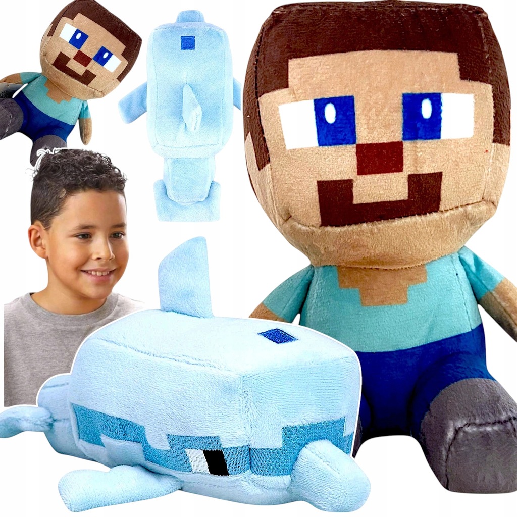 Ten zestaw to gratka dla każdego fana Minecrafta – kultowa postać Steve w jeżdżącej wersji oraz pluszowy delfin, który przypłynął prosto z podwodnych biomów gry! Obie maskotki wiernie odwzorowują pikselową stylistykę znaną z Minecrafta, są miękkie, bezpieczne i idealne zarówno do zabawy, jak i dekoracji dziecięcego pokoju.