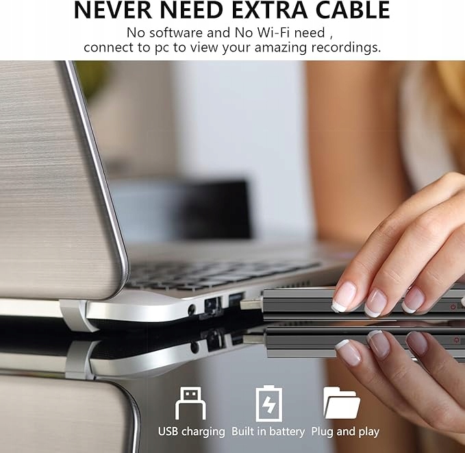 - Kamera z portem USB. Nie potrzebujesz kabla do ładowania, wystarczy podłączyć go do komputera, aby automatycznie odczytać zapisy.