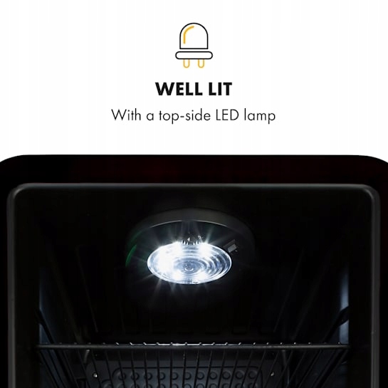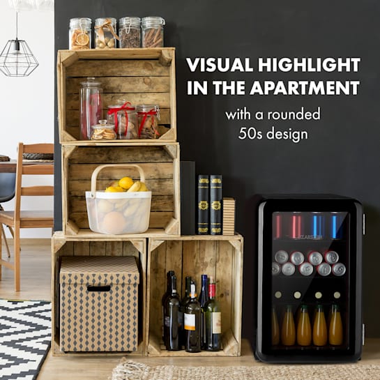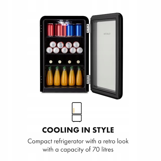 Podwójnie szklone drzwi nie tylko dobrze wyglądają, ale zapewniają w każdej chwili szybki przegląd zawartości lodówki na napoje. Wnętrze jest przy tym utrzymane w stylowym kolorze czarnym, który podkreśla dodatkowo piękny efekt. Okrągły kształt emanuje ponadczasowym urokiem retro i czyni z lodówki dekoracyjny sprzęt w każdym pomieszczeniu.