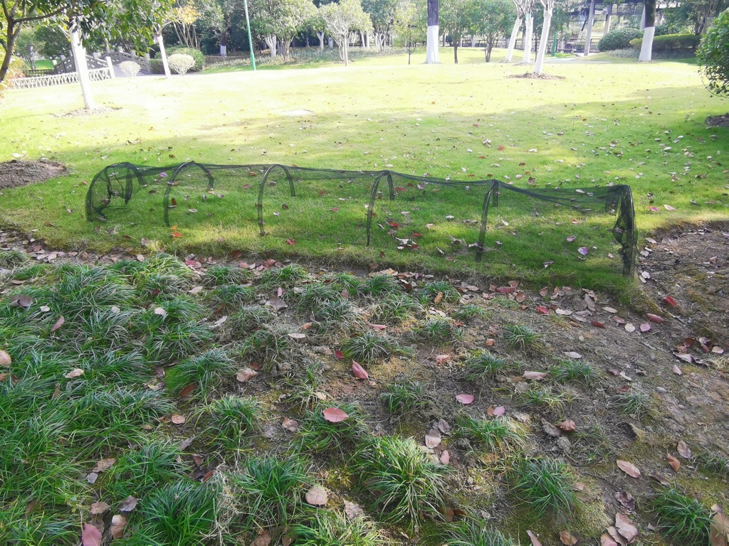 Tunel ochronny dla roślin z czarnej siatki.