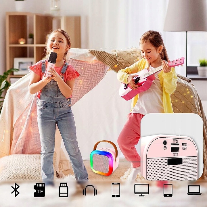 5 magicznych efektów dźwiękowych, które dodadzą zabawy Twojemu przyjęciu karaoke. Dziecięcy zestaw do karaoke dla dziewcząt i chłopców zawiera dźwięki dziewczynek, dźwięków chłopców, dźwięków dzieci, dźwięków potworów i oryginalne dźwięki. Różnorodne tryby oświetlenia, diody LED biją w rytm muzyki, tworząc wesołą atmosferę na imprezę.