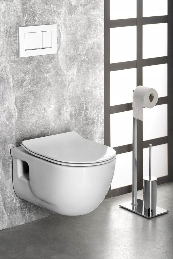 Misa WC o prostych regularnych kształtach z prysznicem bidetowym i technologią rimless, oraz deską wolnoopadającą w wersji slim. Bateria podtynkowa do zakupienia w zestawie, bądź na oddzielnej aukcji.