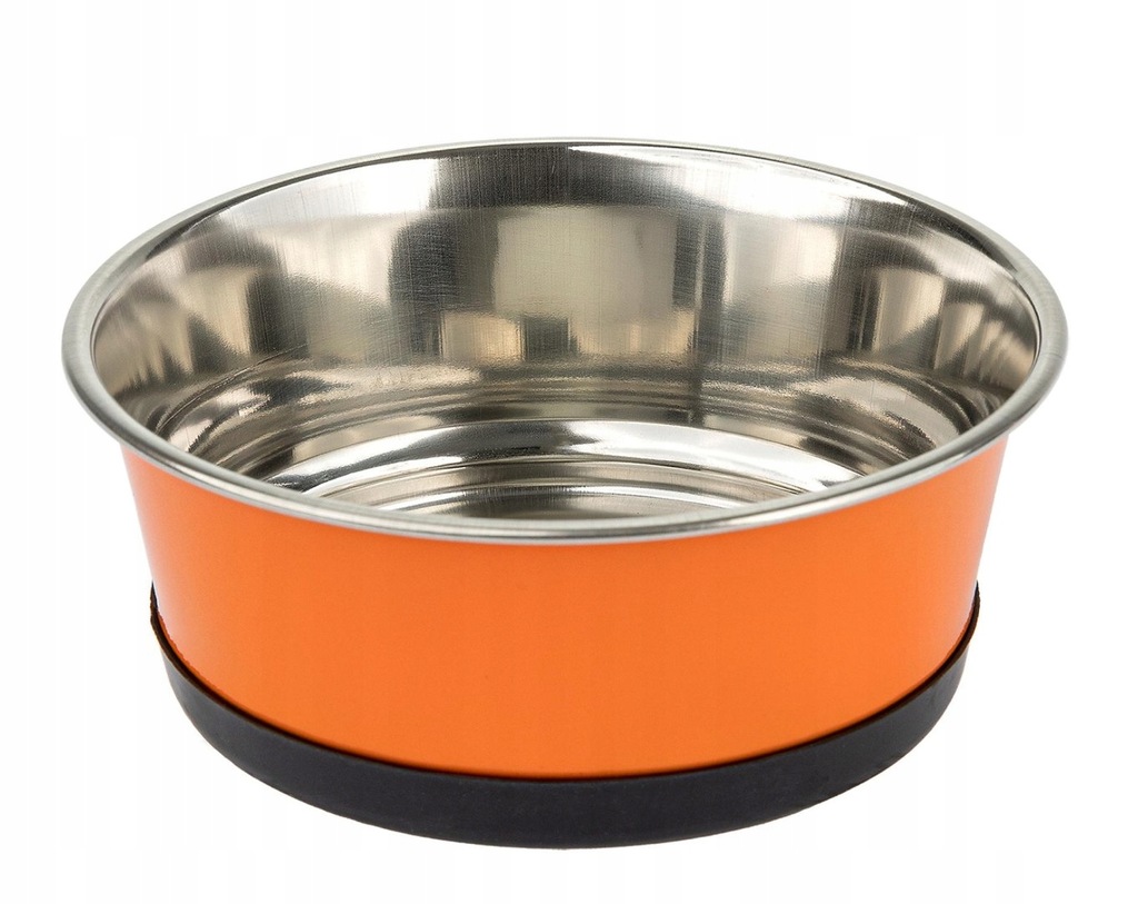 Metalowa miska w kolorze pomarańczowym z błyszczącym środkiem, matowym wykończeniem, oraz grubym dnem.