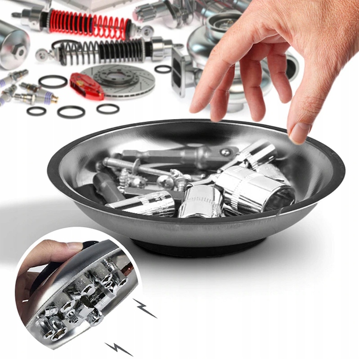 Miska wykonana z blachy nierdzewnej, wyposażona w silny magnes, ułatwia utrzymanie porządku na stanowisku pracy. Gadżet pozwala na przechowywanie różnego rodzaju elementów metalowych podczas naprawy. Magnes pozwala na przymocowanie miski w dogodnym miejscu i zabezpieczają miskę i części w niej przechowywane przed upadkiem i rozsypaniem.