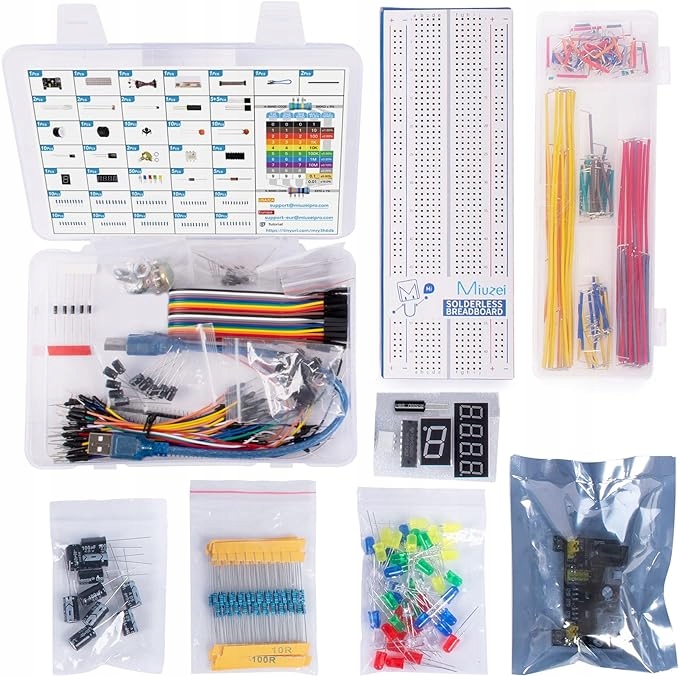 Miuzei Zestaw startowy dla początkujących do breadboard, kompatybilny z Arduino, w zestawie moduł zasilający, kabel oporowy, zestaw diod LED. Miuzei Zestaw elektroniczny kompatybilny z arduino dla Raspberry Pi. Samouczek można pobrać z podanej strony internetowej za pośrednictwem podręcznika, idealny dla rozpoczynających przygodę z elektroniką, aby zrozumieć podstawowe zasady elektronauki. Zestaw startowy elektroniki do Raspberry Pi zawiera 448 różnych komponentów: Supply Module,Precision, 830 Tie-Points Breadboard Kit i inne akcesoria. Bogactwo akcesoriów zapewnia początkującym wiele możliwości eksperymentowania z prostymi projektami elektronicznymi.