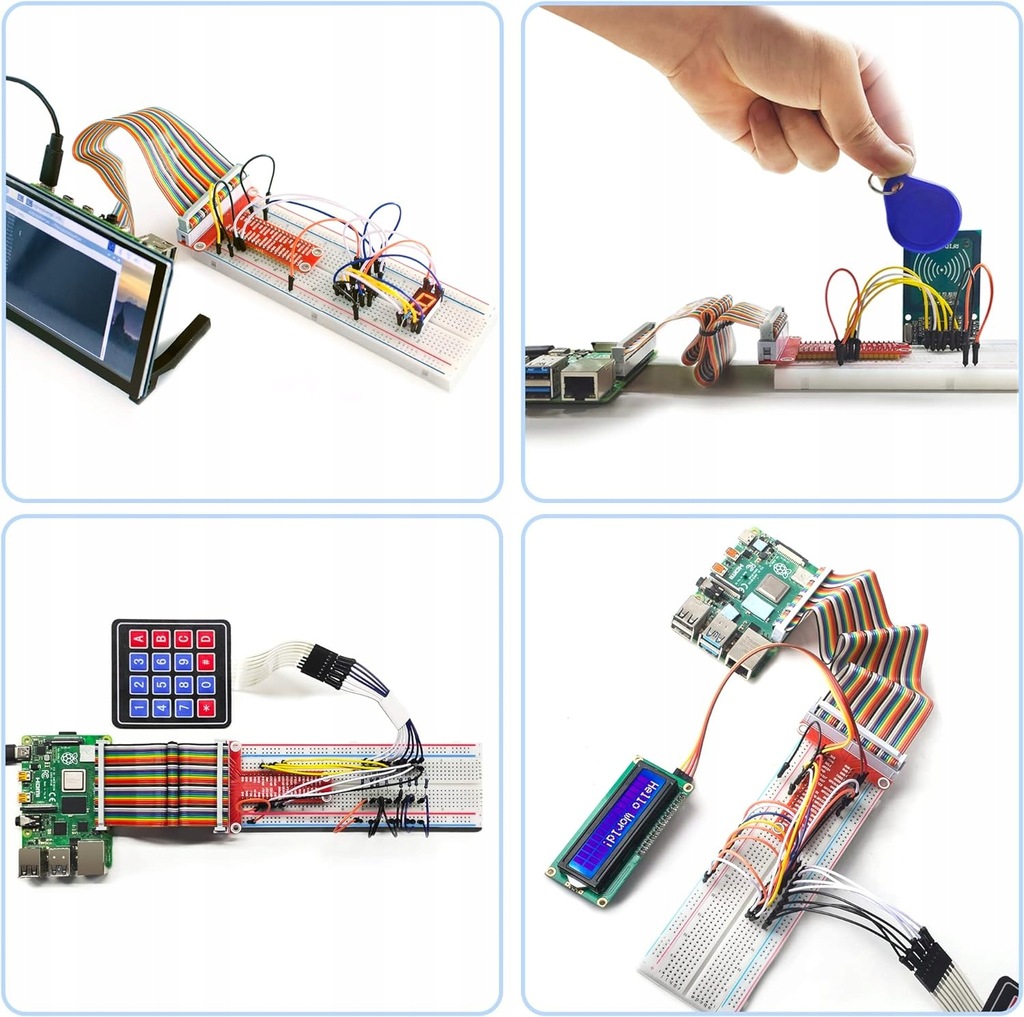 4 x nakładka na klawisze (biały/żółty/niebieski/zielony/czerwony), 4 x przełącznik (duży), 1 x wentylator, 1 x silnik DC, 3 x dwustronna płytka PCB. 1 x moduł RC522 RFID + karta RFID + klucz RFID, 1 x czujnik ruchu na podczerwień, 1 x moduł zasilacza, 1 x 40-pinowy kabel GPIO. 1 x MPUM. Tryb 6050 ul, 1 x moduł klawiatury 4 x 4, 1 x moduł PCF8591, 1 x DHT-11 (czujnik temperatury i wilgotności). 1 x przekaźnik 5 V, 1 x czujnik odległości ultradźwiękowej, 5 x białe diody LED, 5 x żółte diody LED, 5 x niebieskie diody LED, 5 x zielone diody LED, 5 x czerwone diody LED, 1 x RGB LED. stor (22) 0R), 10 x rezystor (10 K), 10 x rezystor (1 K), 10 x rezystor (5,1 K), 10 x rezystor (100 K), 10 x rezystor (10R), 10 x rezystor (100R), 10 x rezystor (330R), 10 x rezystor × Rezystor (1 m), 4 x dioda Zenera, 4 x dioda IN407, 1 x ULN2003 płytka sterownika silnika krokowego. 1 x 40 pinów płytka Breakout GPIO, 1 x serwo silnik (SG90), 1 x moduł joysticka, 1 x L293D IC, 2 x IC 74HC595, 1 x - Końcówka belki LED. iagram. 1 x 1-Digit 7-segmentowy wyświetlacz, 1 x wyświetlacz matrycy punktowej 8 x 8, 1 x 4-Digit 7-segmentowy wyświetlacz, 1 x kabel Jumper F/M, 1 x silnik krokowy. 1 x kabel rozruchowy F/F, 1 x 40-pinowa listwa na długopisy, 1 x 40-pinowa żeńska listwa z pinami. E, 1 × Plastikowe pudełko.
