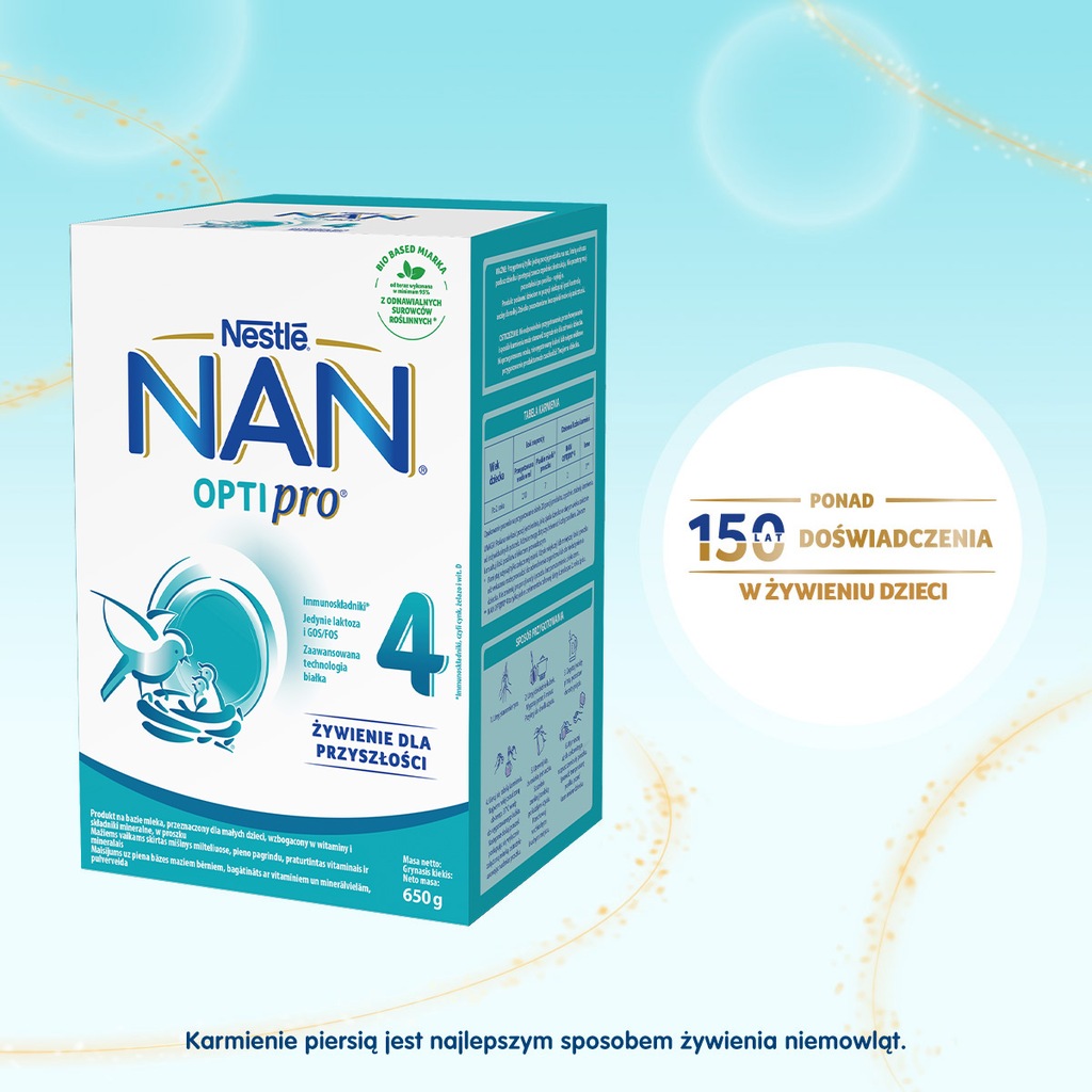 Nan Optipro 4, mleko modyfikowane w proszku to środek spożywczy specjalnego przeznaczenia żywieniowego, mleko modyfikowane w proszku, wzbogacone w witaminy i składniki mineralne dla dzieci po 2. roku życia. W porównaniu do mleka krowiego, mleko modyfikowane Nan ma między innymi niższą zawartość białka, a wyższą zawartość żelaza, witaminy C, witaminy D, kwasów tłuszczowych omega 3. Zawiera także kultury bakterii probiotycznych, korzystnie wpływających na układ pokarmowy dziecka.